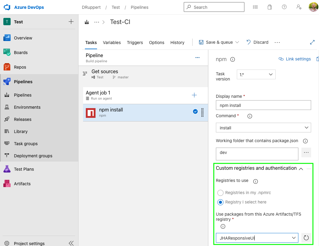 - In your pipeline npm install step, expand the Custom registries and authentication section. Select the Registry I select here option and select your newly created service connection.
