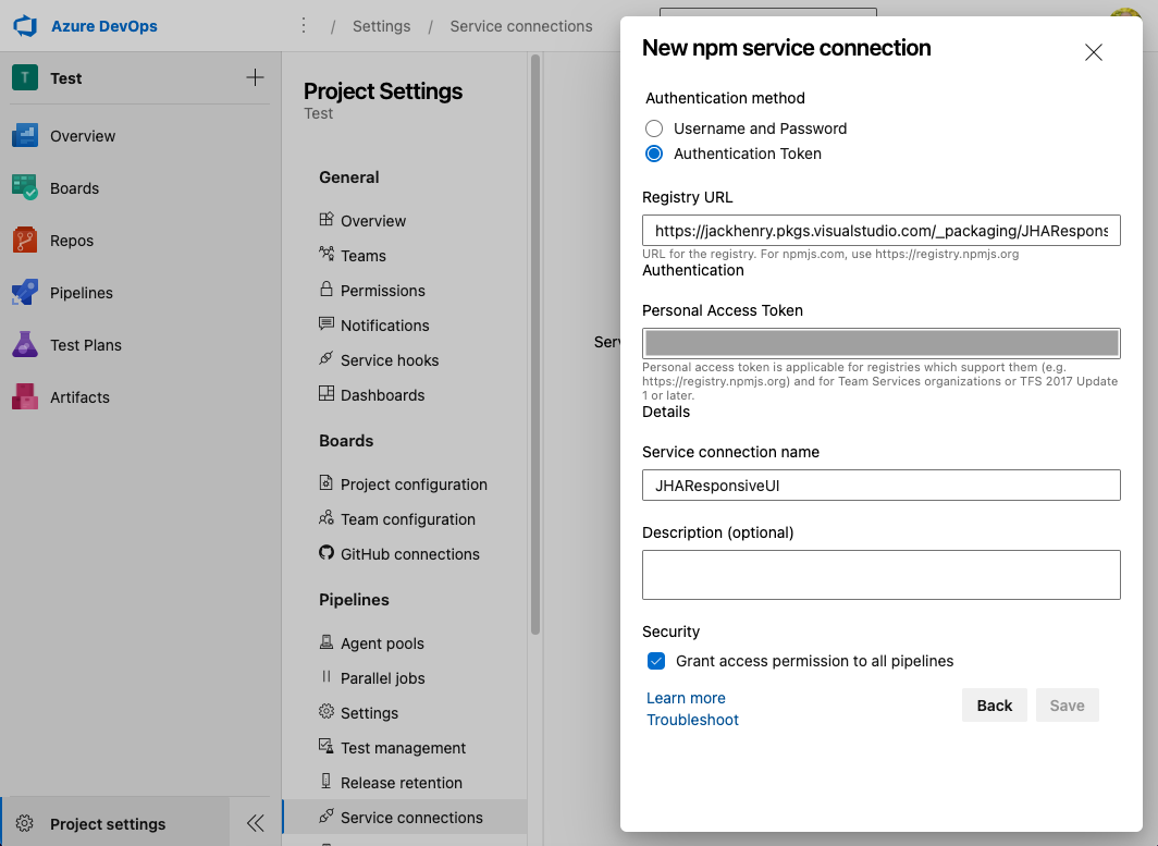For the Personal Access Token, create a new PAT within your User Settings, but ensure that you’re in the JackHenry organization. Paste that PAT in the Personal Access Token input. Do not base64-encode the PAT like you would when pasting a PAT into an .npmrc file.